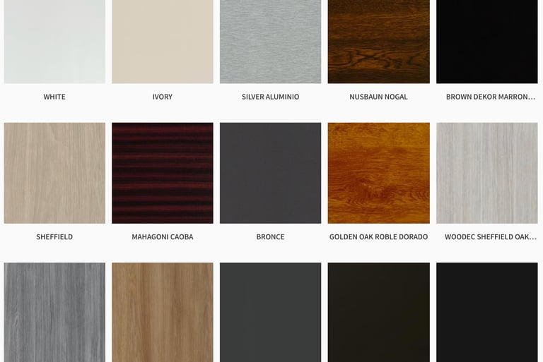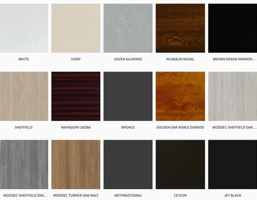 Contamos con una amplia gama de colores para satisfacer las necesidades o exigencias de nuestros clientes, en el caso de los tonos madera cuentan con textura. Los perfiles ALUPLAST® de PVC con acabados de color foliados son: